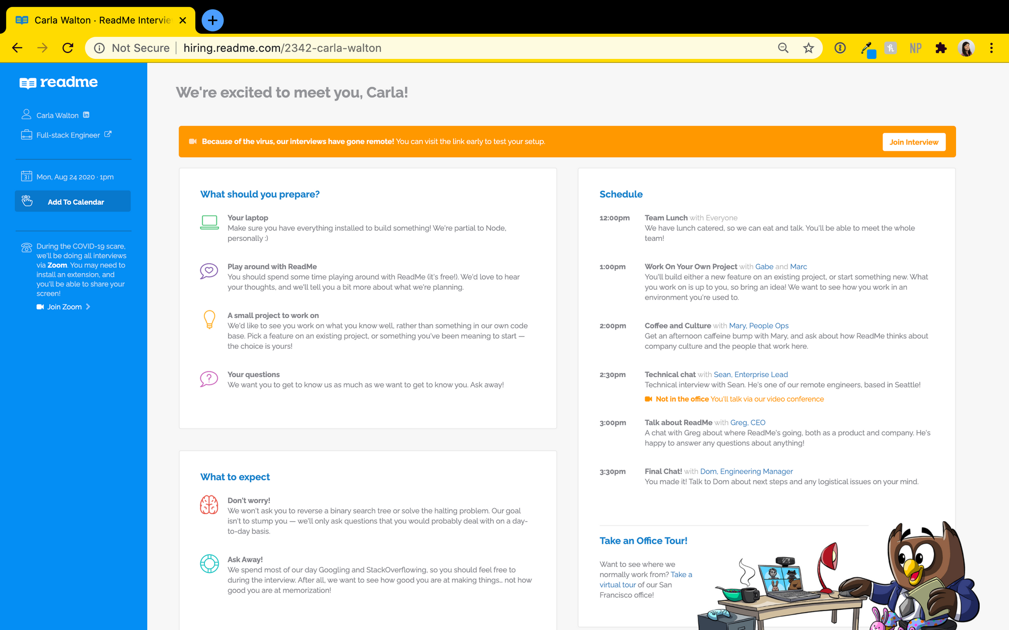 It goes over where to go, what they need to bring, how to get in, and how to approach interviewing with us. In COVID times, it includes a Zoom link, and a virtual tour of the office, since we're doing our onsites remotely. Interviewing anywhere can be nerve-wracking, and we want to let people focus on showing what makes them special and unique, rather than having to worry about the logistics.