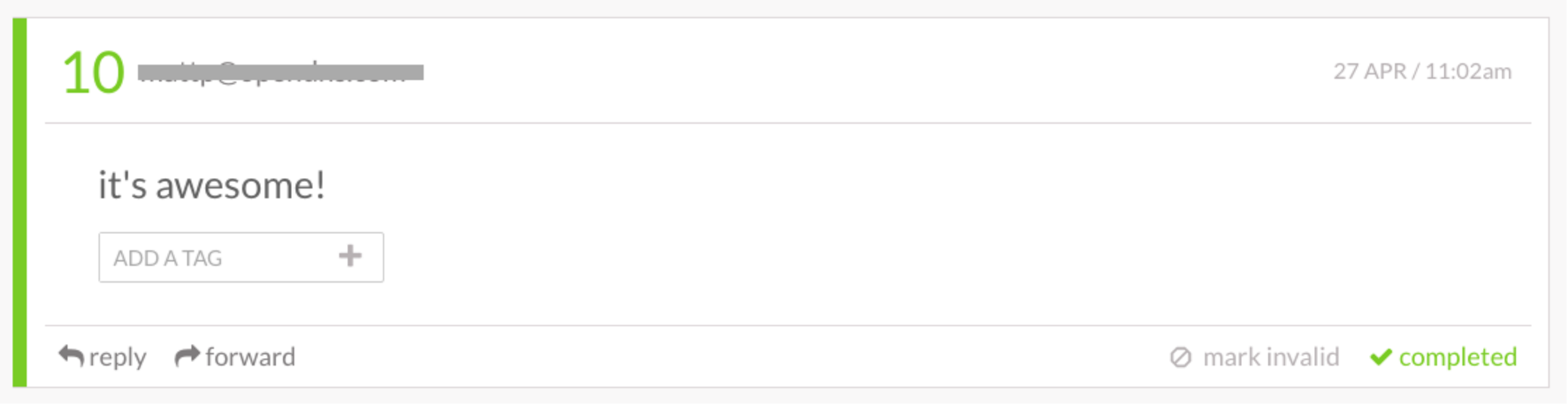 Wootric provides a simple dashboard of user feedback, including email addresses and a nice “completed” button to track who you’ve contacted.