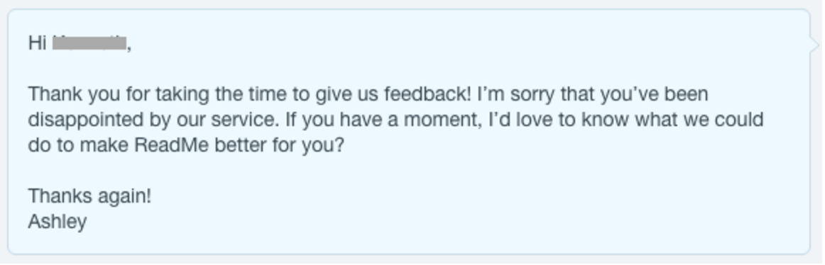 - FOLLOW UP. We’re SO thankful for every one who took the time to give us feedback. It helps us make ReadMe better and we really couldn’t do it without the help of our users. To show how much it matters to us, we followed up with every single user by hand (technically, keyboard). This is especially important for the feedback that’s hard to take, we know we’ve disappointed people, and we want them to know what we’re doing to make it up to them.