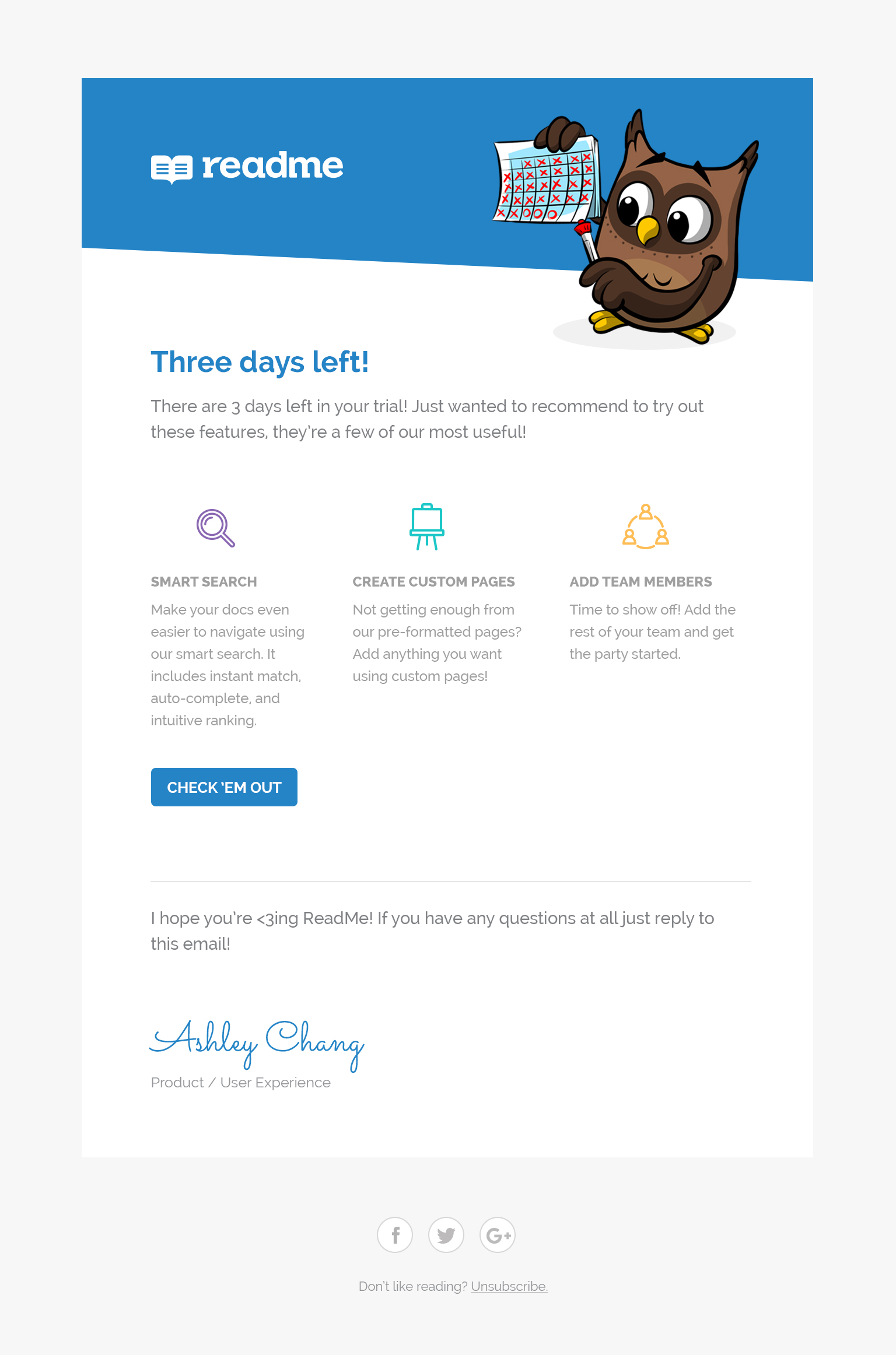 (3) 3 days left in trial: Before this email, a lot of people would delete their project after the trial because they didn't remember to try it out. This gives people a warning and recommends a few easy ways to delve into ReadMe in a short time.