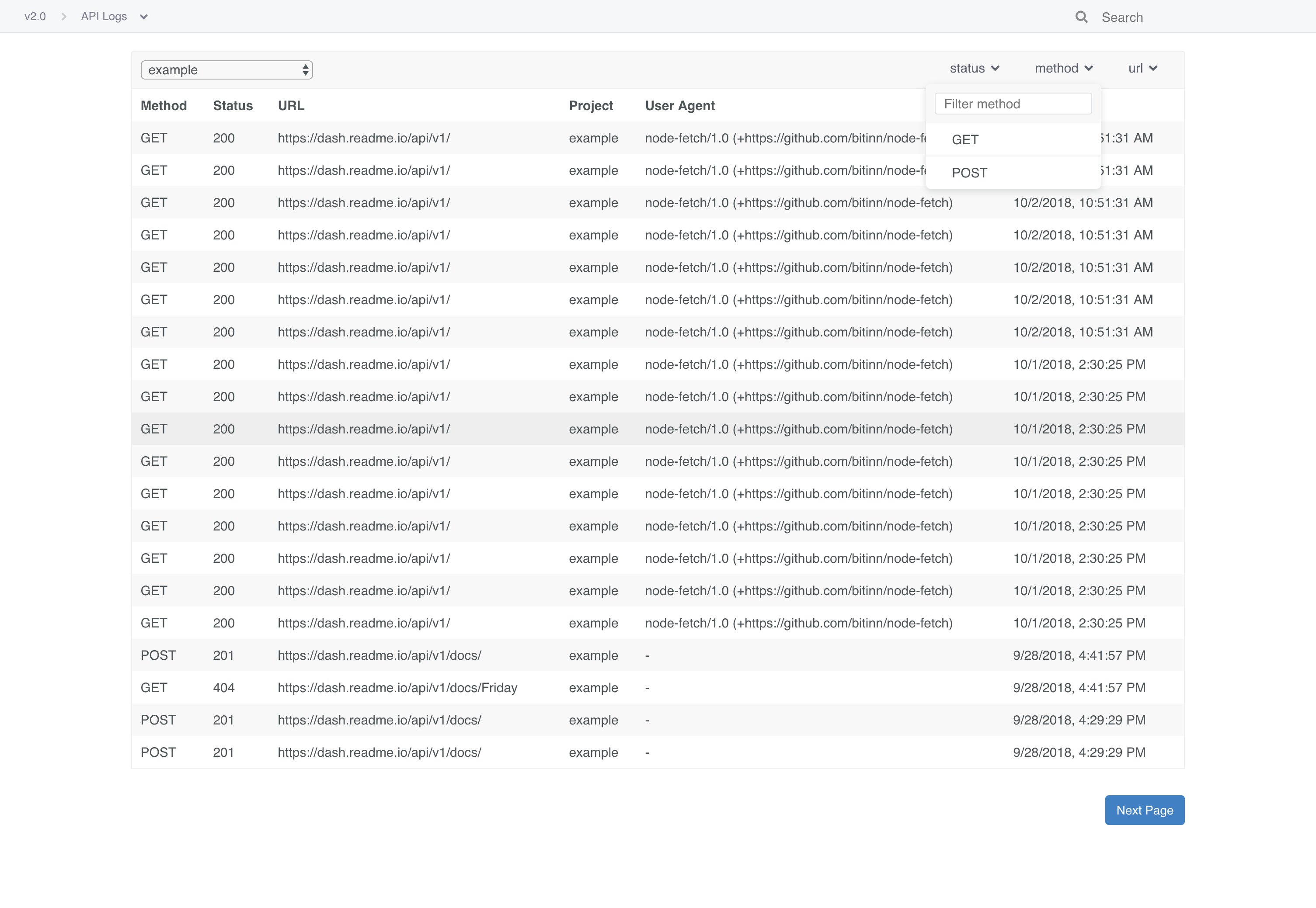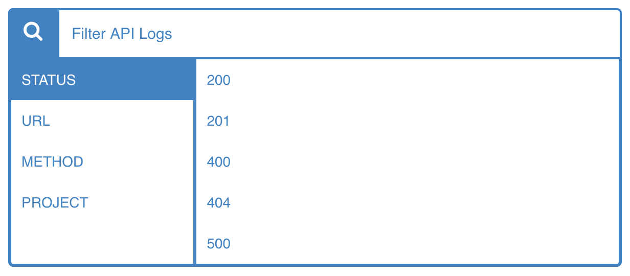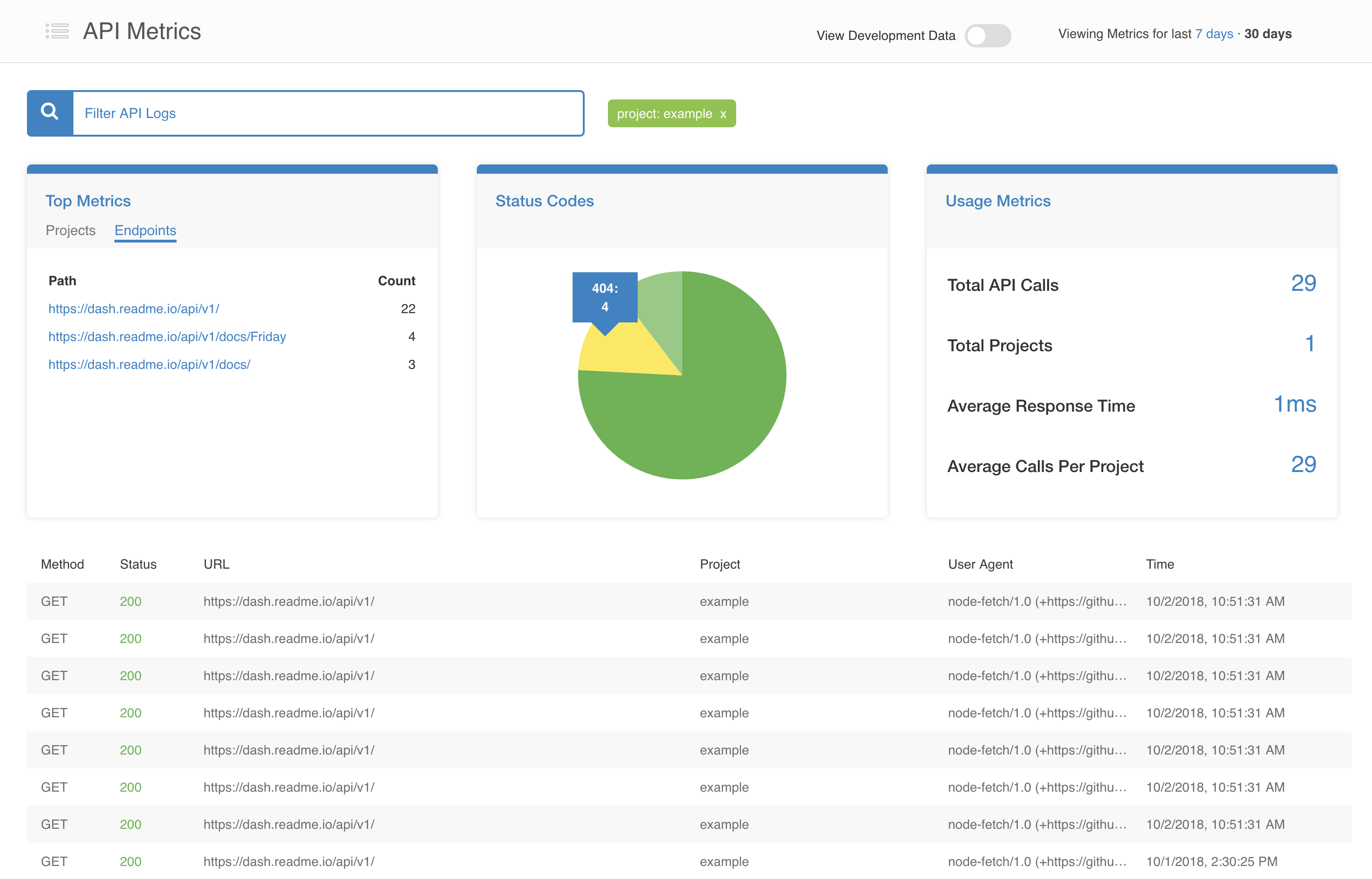 The dashboard gives any Admin in your ReadMe project the ability to segment your APIs logs by status code, endpoint, method, project or any combination of those four filters.