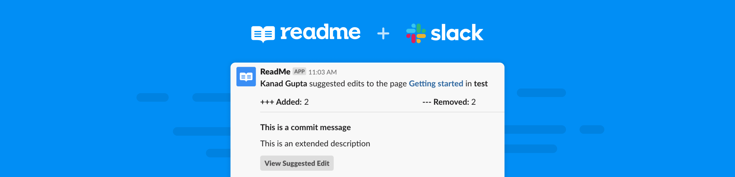 Simply click the Add to Slack button in your Project Integrations settings in ReadMe (Configuration > Integrations) and you'll instantly set up notifications in your Slack workspace for the following: