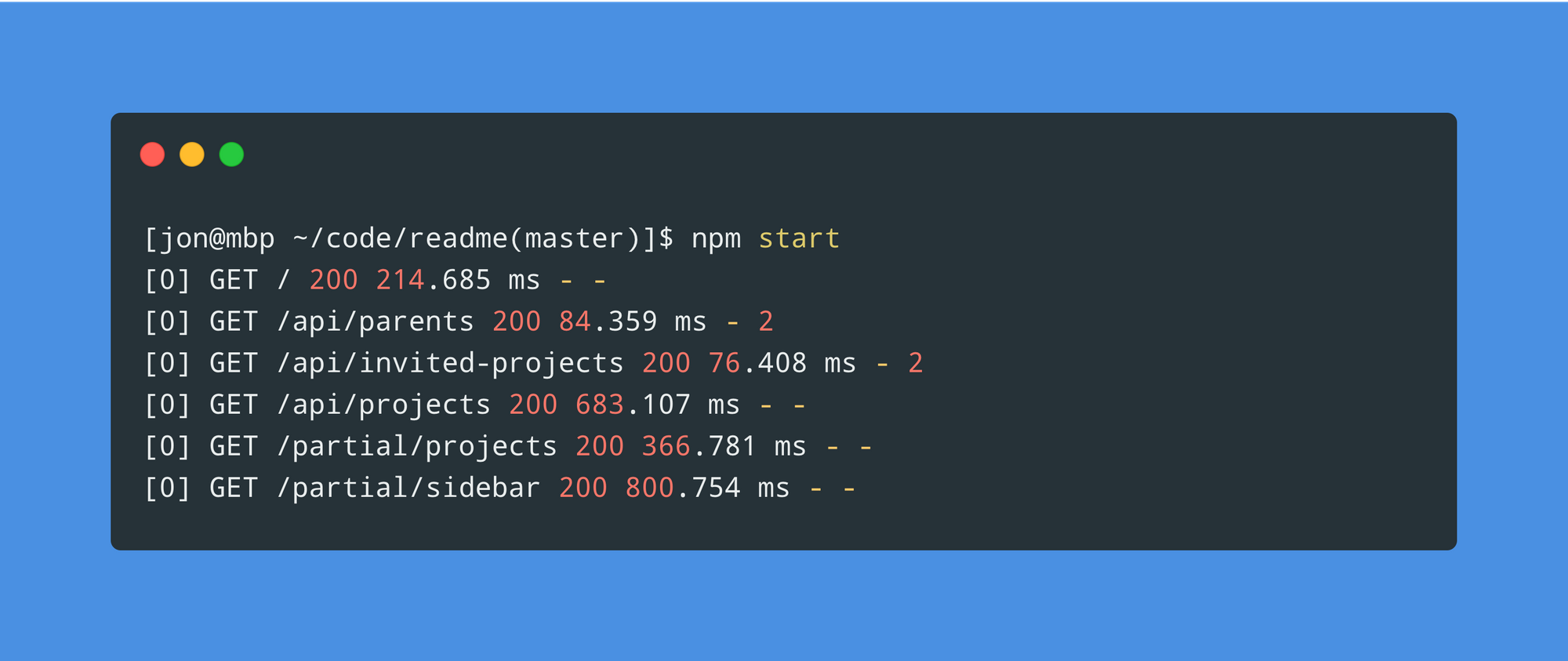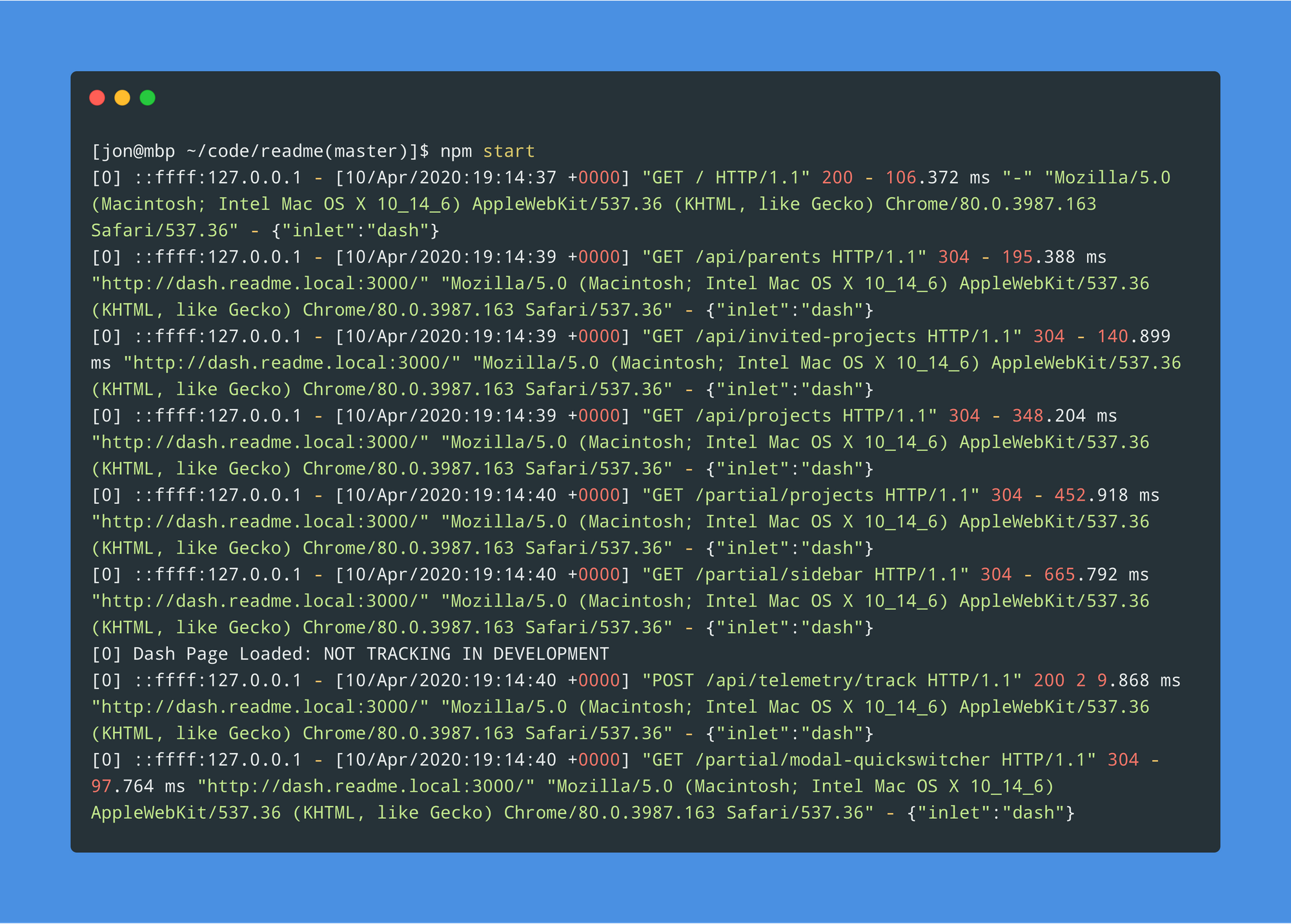 While these logs are great for local development, logging this format in production is less so. There’s no dates, user-identifiable data, or information on the ReadMe project that was used, and we don’t have Heroku’s X-Request-ID header anywhere. We can do better than this, and thankfully Morgan is extensible for us to log whatever we want by constructing some custom middleware and passing it a custom function: