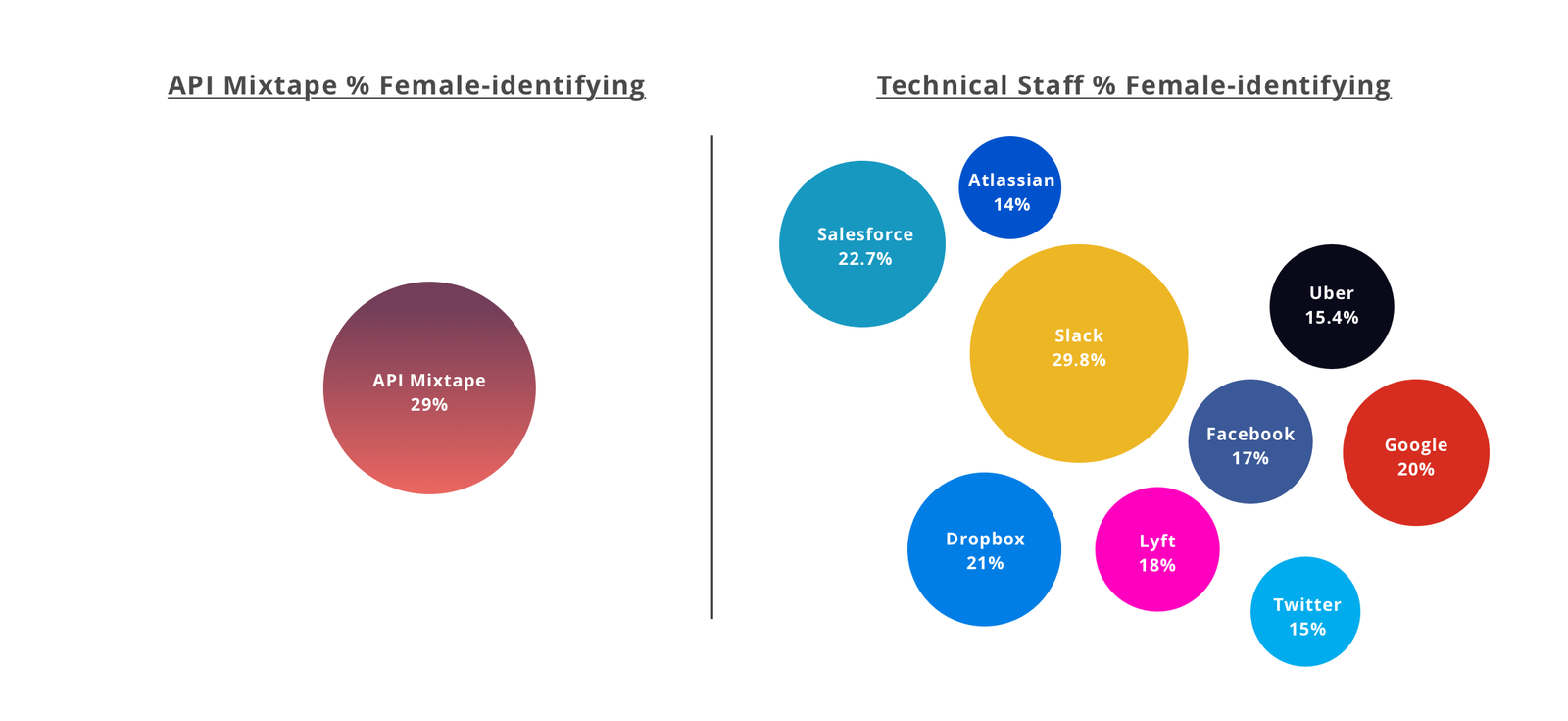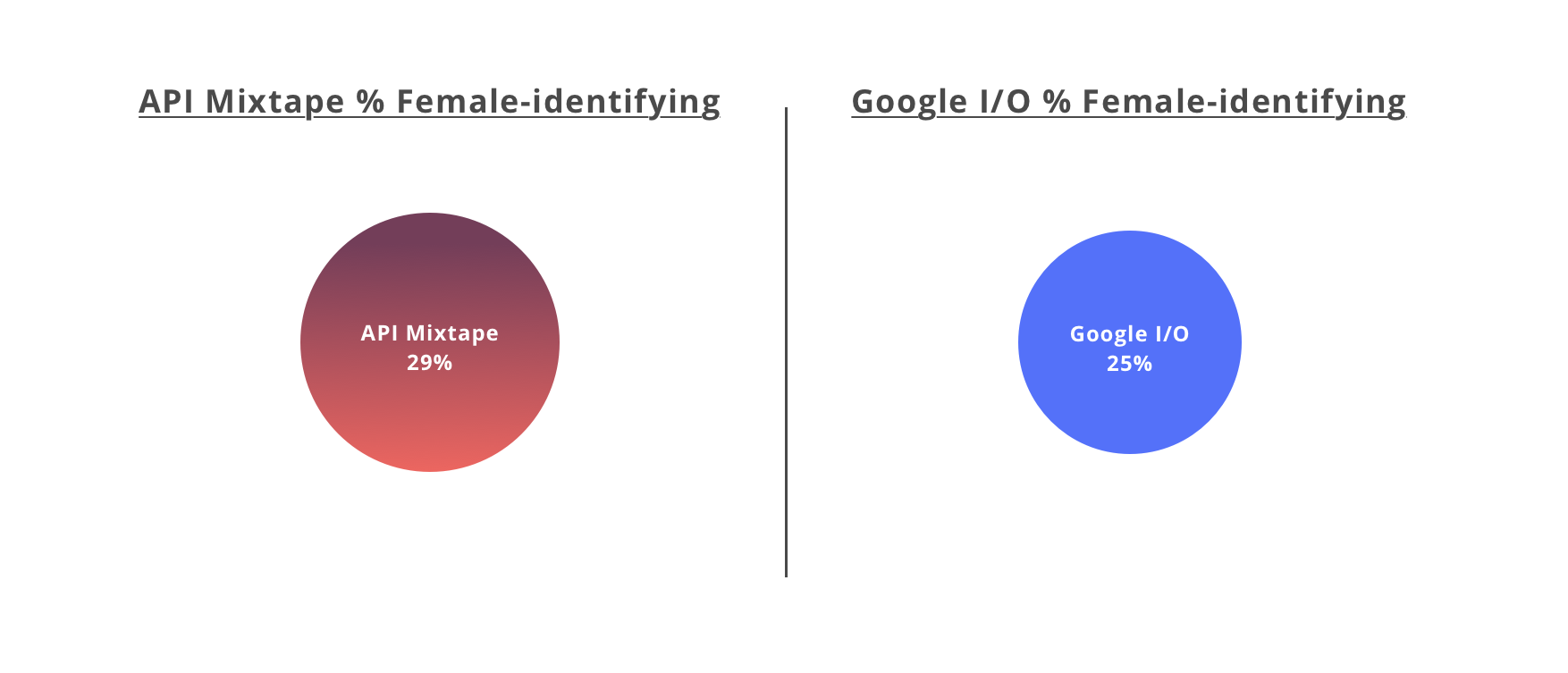 Since the topics covered at our conference were aimed at developers, we also compared our numbers to the average technical representations throughout the industry. Here’s how they clock-in according to their most recent public diversity reports.