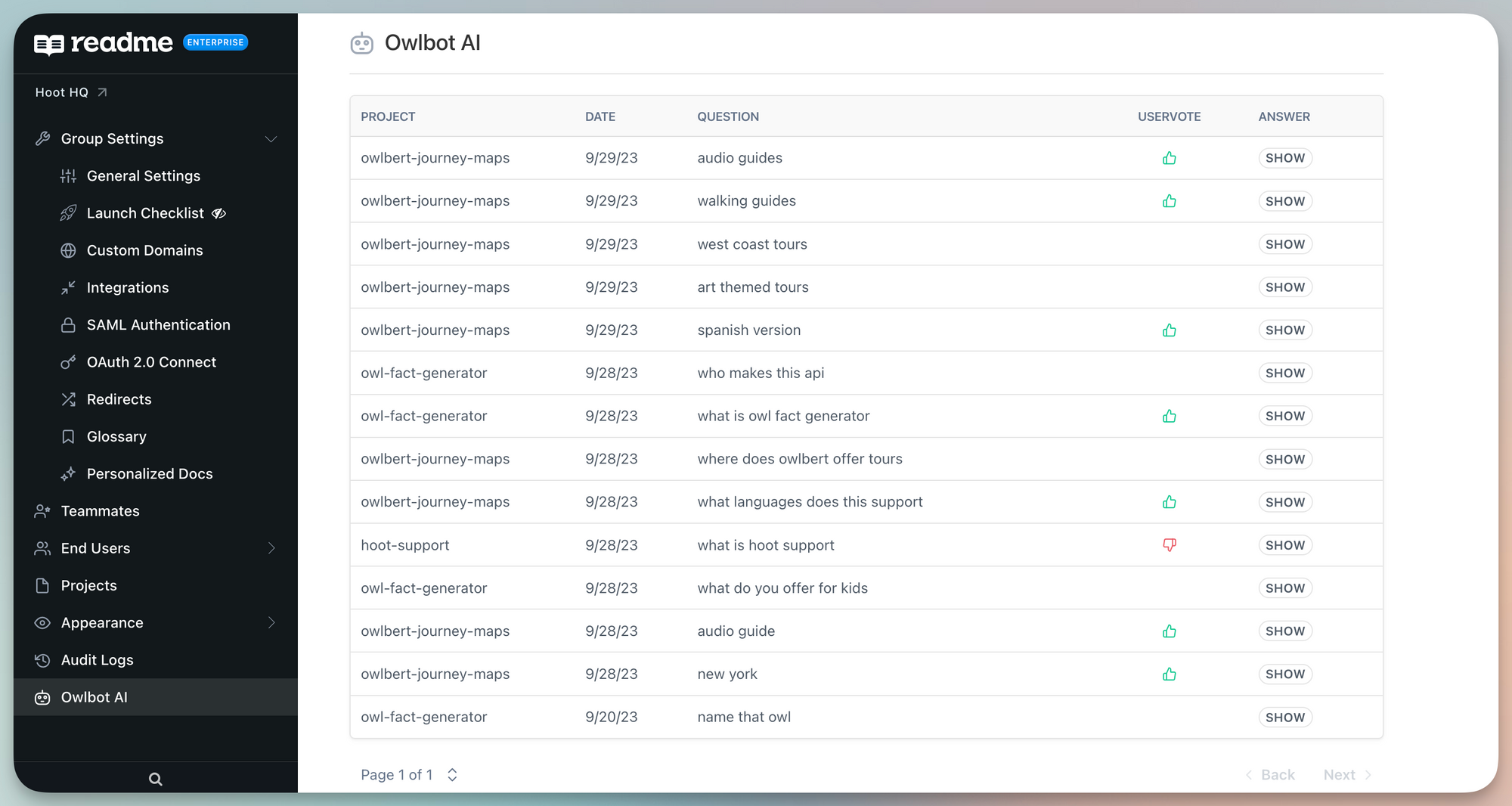 After Owlbot AI is enabled, you’ll be able to see a dedicated page for it in the Project section of your dashboard. Here, you can see all of the questions that visitors to your hub have asked, and what answers were generated.