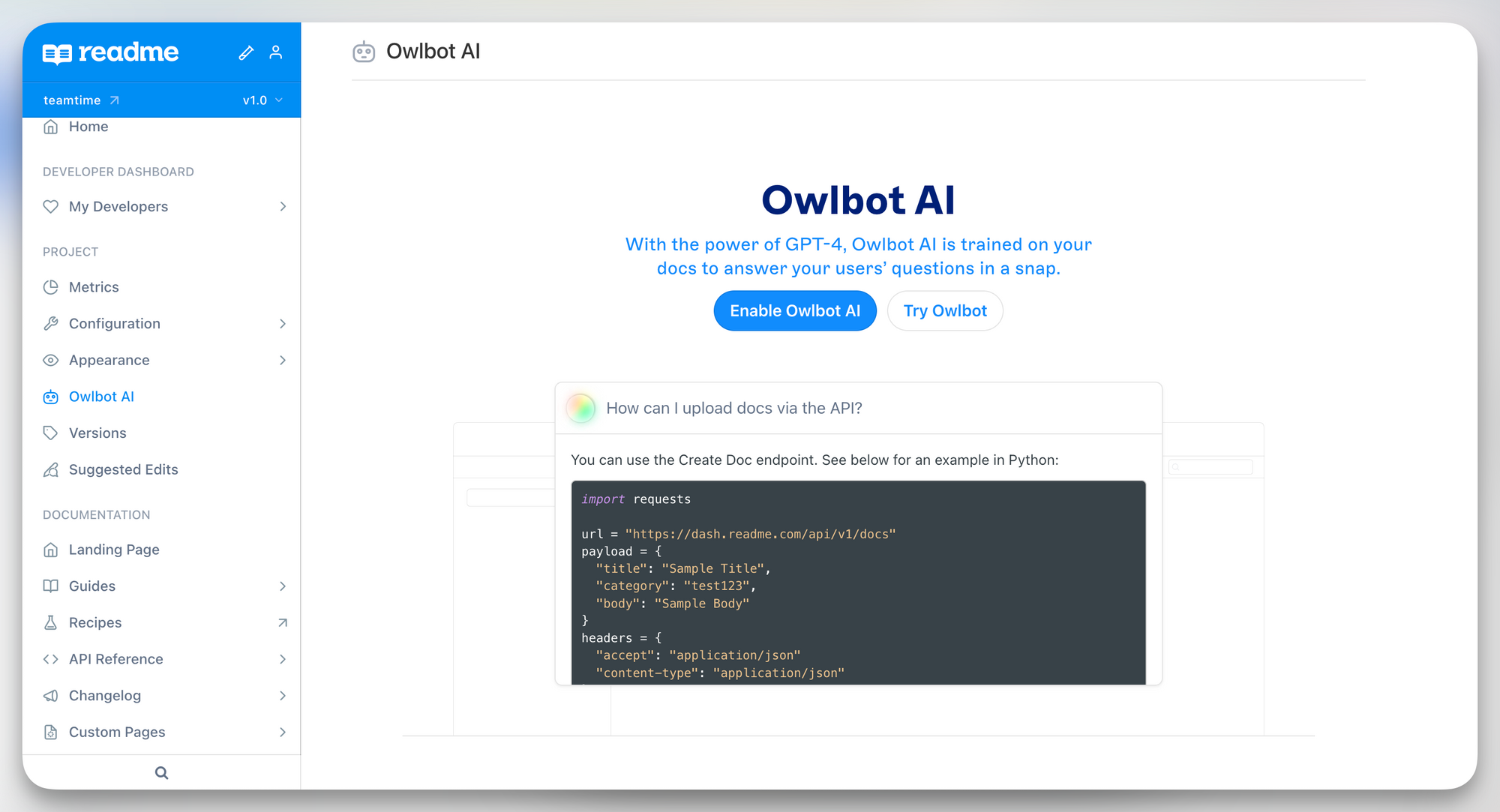 To help you solve that problem for you and your developers, we created Owlbot AI: a new way to enhance your developer experience across your documentation. Owlbot AI is a chatbot that lives inside your hub’s search, so developers can ask Owlbot their questions and get an instant response. It’s your docs, made better and more powerful 💪