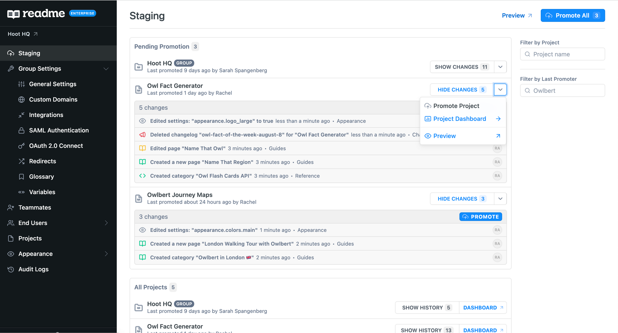 When we first launched Staging for our Enterprise customers, our goal was to give a layer of protection to their published developer hubs. By making it easy to preview changes in a safe sandbox before pushing changes live to production, Enterprise Group Admins could rest easy knowing they had final sign-off on any updates to their hubs. Since then, we’ve been hard at work improving ReadMe’s overall editing and publishing experience, and we’ve got a major Staging update to share with you today, with more coming soon 🔧